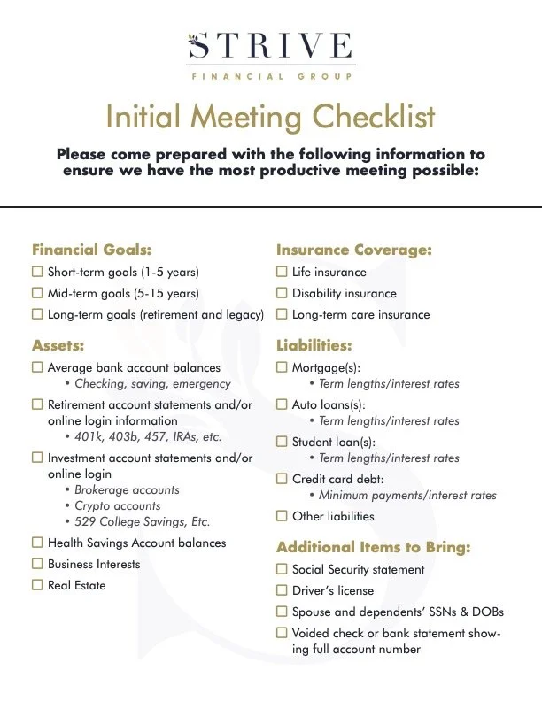 Please ensure you have account statements and/or login info for every applicable item on the Pre-meeting Checklist